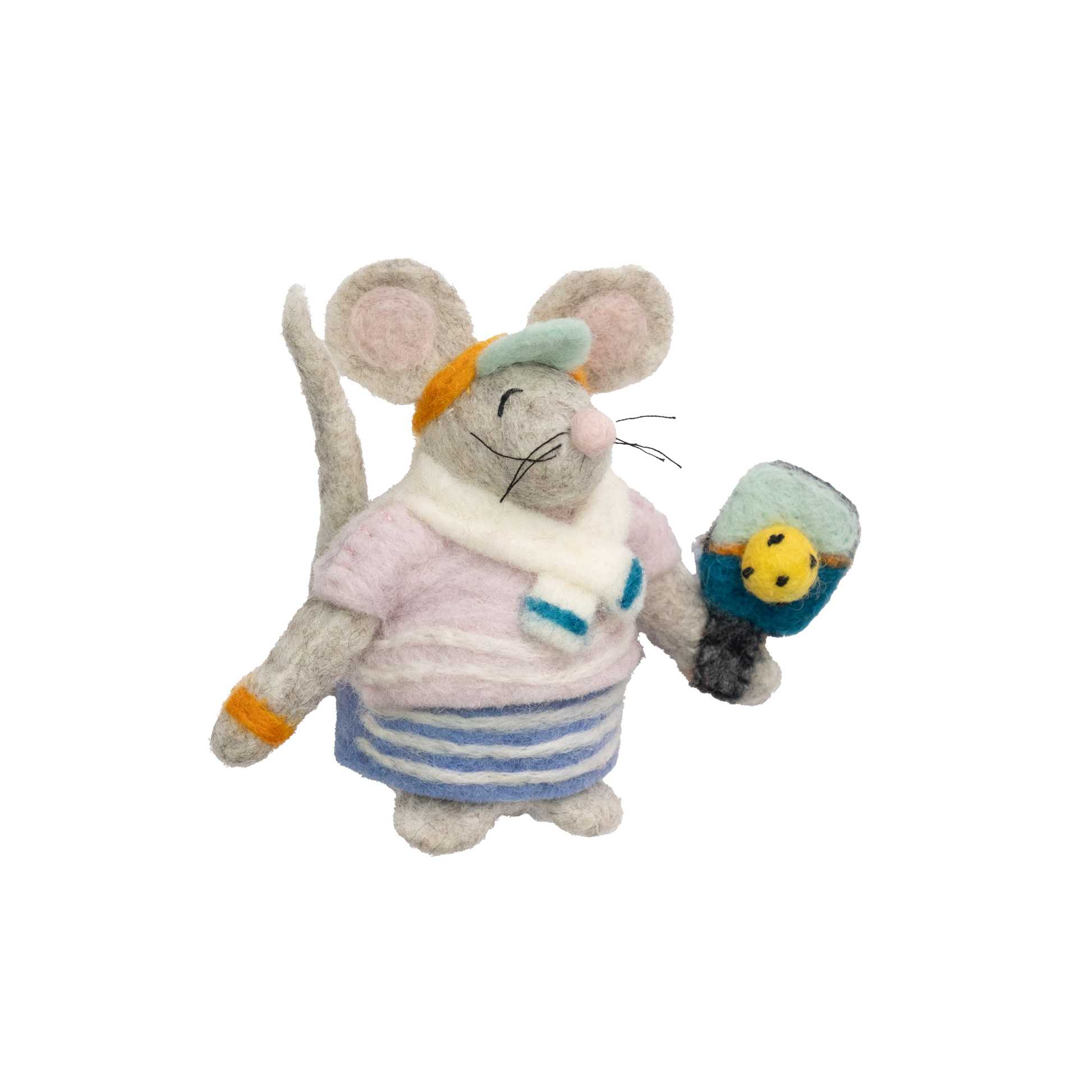 Game, set... squeak! Our Felt Pickleball Mouse Ornament is here to serve up some serious holiday fun. Dressed in a retro striped sweater, matching skirt, bright orange visor, and tiny sweatbands, this sporty little mouse is fully geared up with a pickleball paddle and ball in paw. Whether you're a die-hard player or just love a good laugh, this adorable ornament is the perfect way to celebrate your pickleball obsession.